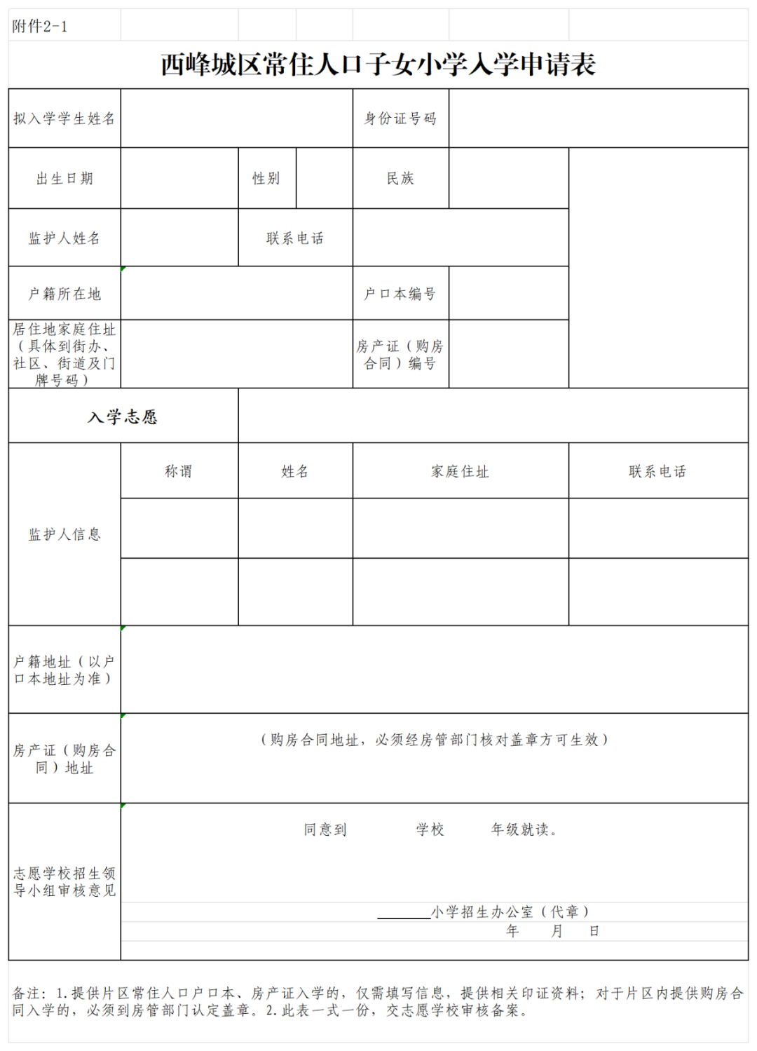 附件2-1:西峰城區(qū)常住人口子女小學(xué)入學(xué)申請(qǐng)表