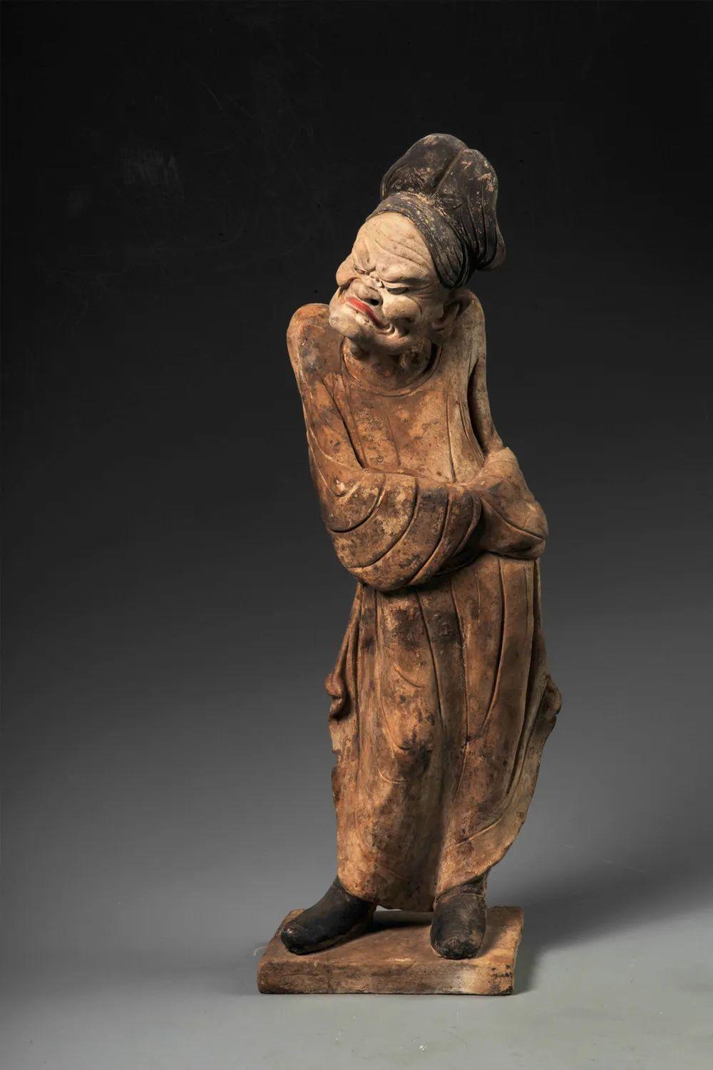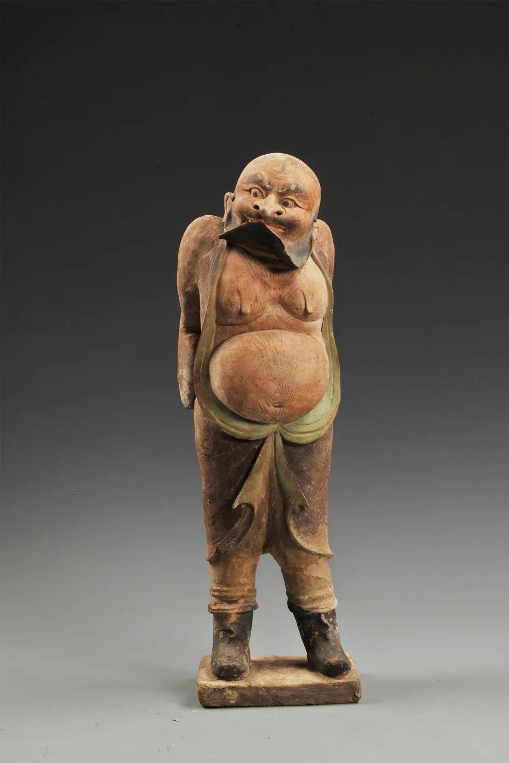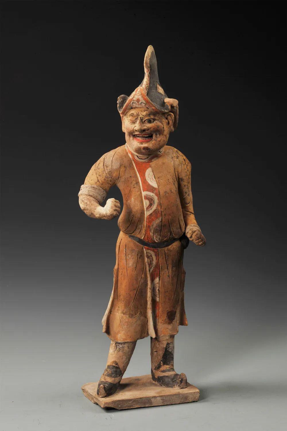 作為隨葬品的胡人俑,生動(dòng)再現(xiàn)了絲綢之路上外國(guó)人來華的盛況,再看另一尊胡人俑——彩繪灰陶參軍戲俑,高帽和衣襟處皆有朱色花紋,他高鼻深目,胡須濃密,一目圓睜,一目微閉,口唇涂朱,露出牙齒,這笑容不像大唐一人俑,倒像生動(dòng)立于你面前一活人,面部表情生動(dòng),意味悠長(zhǎng)……