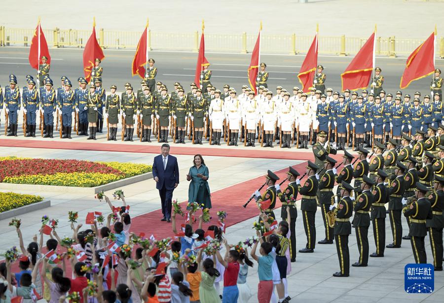 6月28日下午,國(guó)家主席習(xí)近平在北京人民大會(huì)堂同來(lái)華進(jìn)行國(guó)事訪問(wèn)的秘魯總統(tǒng)博魯阿爾特舉行會(huì)談。這是會(huì)談前,習(xí)近平在人民大會(huì)堂東門外廣場(chǎng)為博魯阿爾特舉行歡迎儀式。新華社記者 高潔 攝