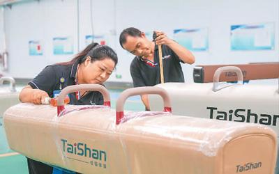 7月8日,在山東省泰山體育器材有限公司生產(chǎn)車間,工人在檢測剛下線的鞍馬。新華社記者 朱崢攝