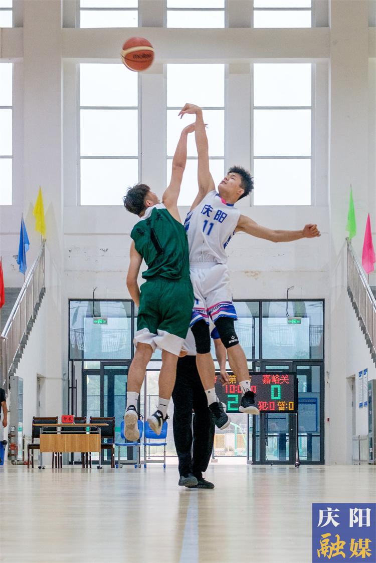 2024年甘肅省青少年籃球錦標(biāo)賽青年男子組比賽中,慶陽市代表隊(duì)和嘉峪關(guān)市代表隊(duì)爭奪球權(quán)。