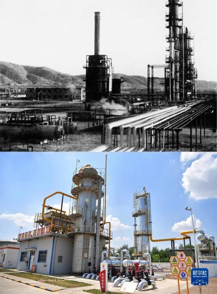 拼版照片:上圖為1978年長慶油田馬嶺煉油廠的生產(chǎn)裝置(資料圖片,長慶油田采油二廠供圖);下圖為2022年5月24日拍攝的長慶油田采油二廠新一代的原油穩(wěn)定裝置(新華社陳斌/攝)