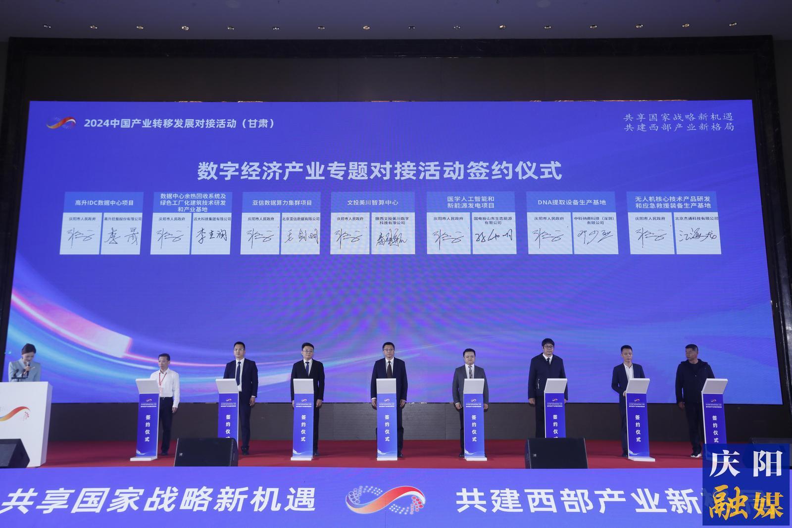 中國信通院黨委副書記王曉麗,省工信廳副廳長黃寶榮,絲綢之路信息港股份有限公司黨委副書記、總經(jīng)理趙四輩,中國能建西北區(qū)域總部黨委書記、總經(jīng)理徐剛,甘肅政法大學黨委常委、紀委書記焦愛勝等出席。慶陽市委常委、常務副市長劉長發(fā)主持活動,副市長張平宗代表慶陽市政府與企業(yè)簽約,現(xiàn)場簽約項目14個、簽約額111.45億元。在當天上午舉行2024中國產(chǎn)業(yè)轉移發(fā)展對接活動(甘肅)開幕式上,慶陽市還現(xiàn)場簽約項目2個,簽約額611億元。