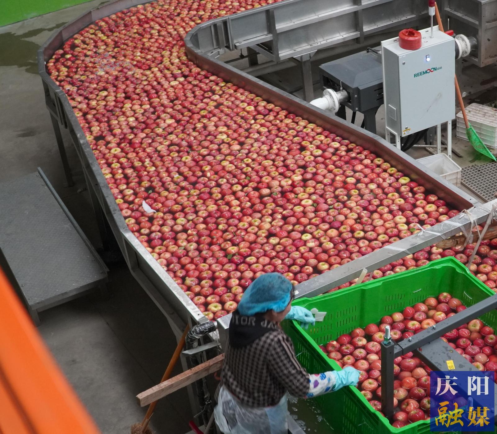 分揀、裝箱、運輸……走進慶新莊園蘋果倉儲車間,只見一輛輛滿載著蘋果的大型貨車整裝待發(fā),一顆顆經(jīng)過檢測、分選、清洗、裝箱等工序的蘋果正在從這里集結(jié)出發(fā),運往全國各地。