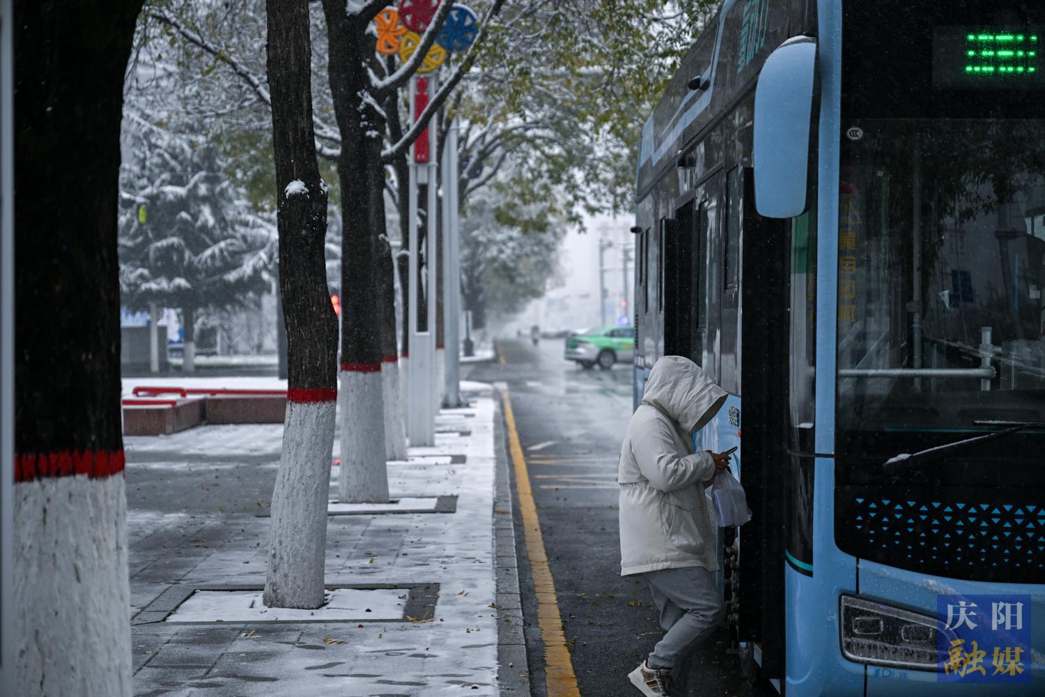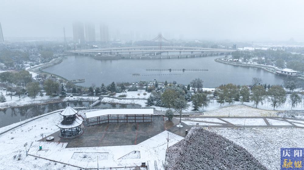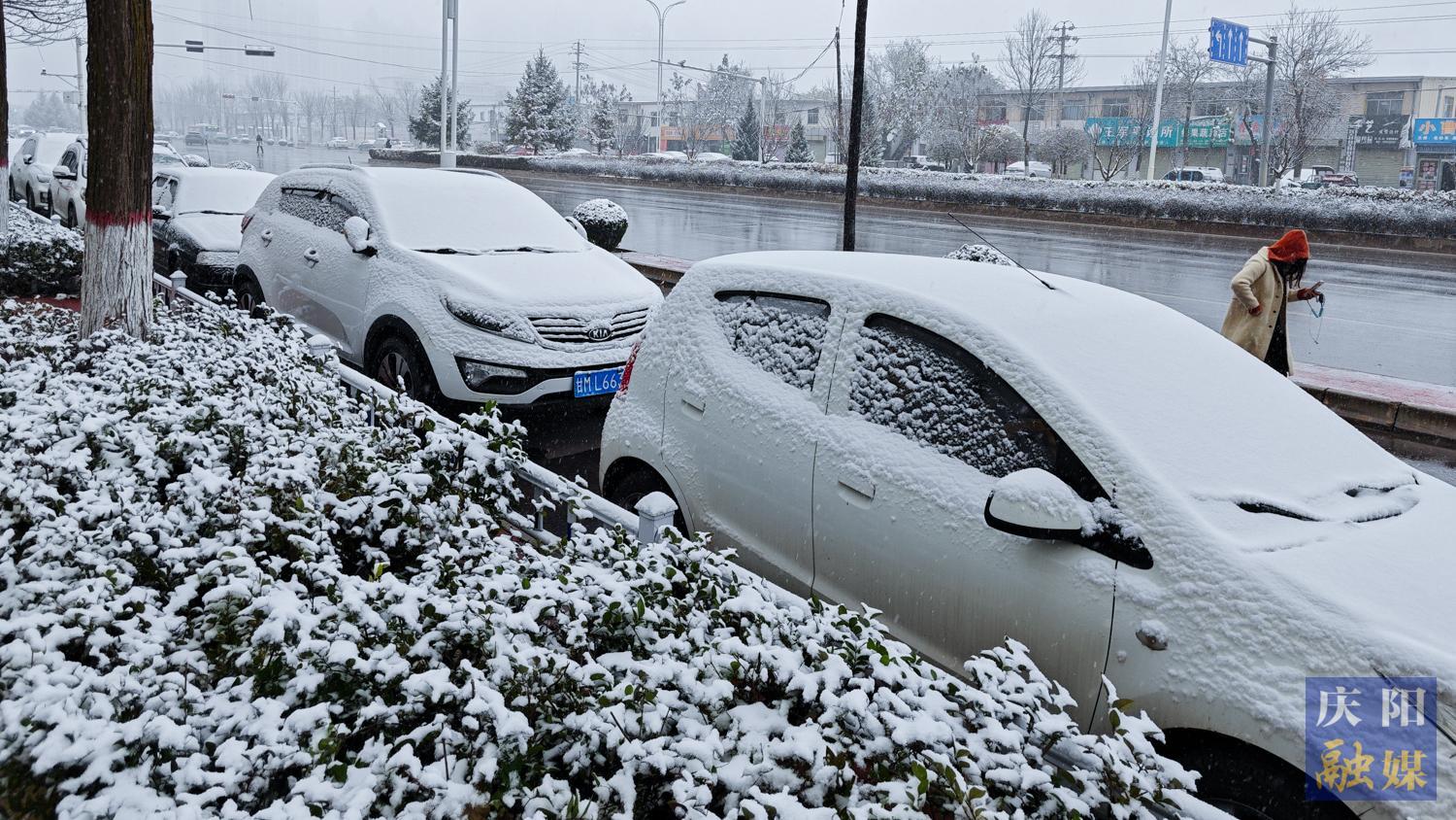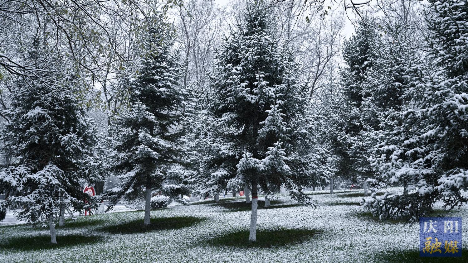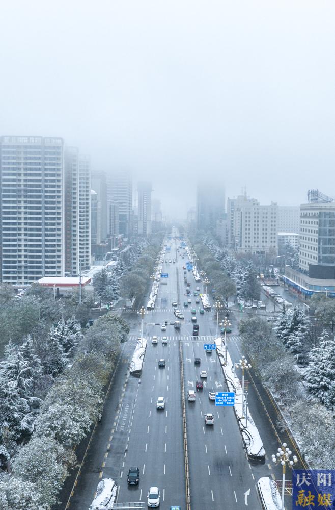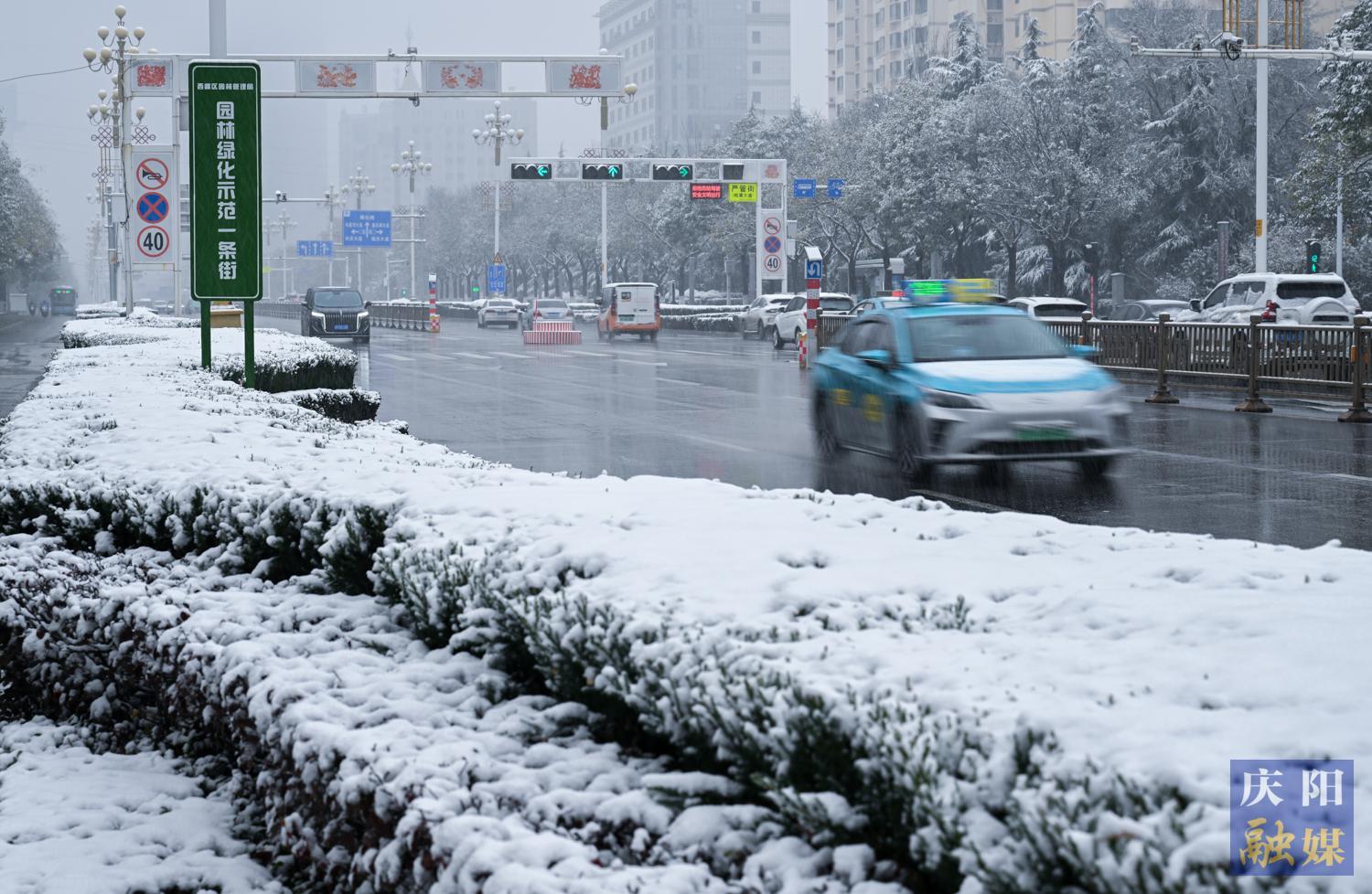 西峰區(qū)北京大道兩側(cè)綠植被積雪覆蓋。