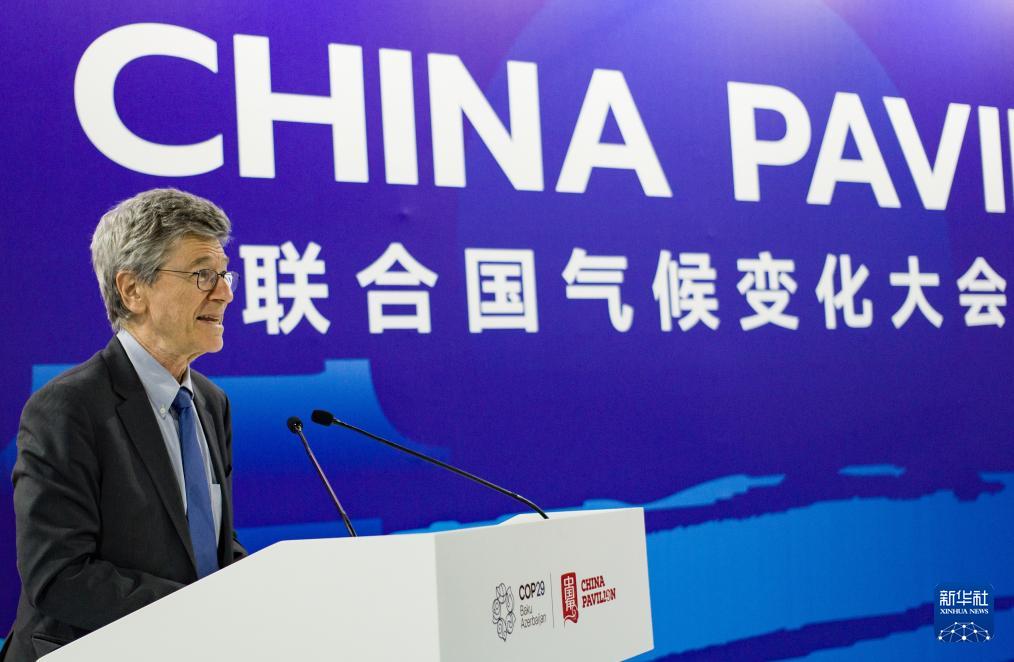 11月15日,在阿塞拜疆首都巴庫(kù),聯(lián)合國(guó)可持續(xù)發(fā)展解決方案網(wǎng)絡(luò)負(fù)責(zé)人、美國(guó)哥倫比亞大學(xué)教授杰弗里·薩克斯參加COP29中國(guó)角邊會(huì)時(shí)講話。新華社記者 孟菁 攝