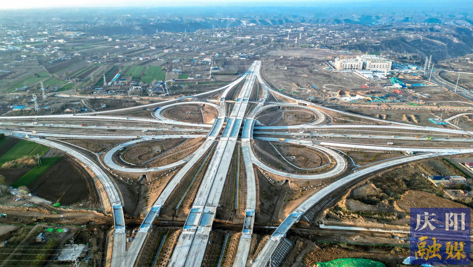 慶陽網(wǎng)訊(慶陽融媒記者 陳飛 俄少飛 石強 盤小美 特約攝影 王啟寧 李富昌 張應(yīng)君 通訊員 楊安)西合公路、東繞城公路通行車輛快速轉(zhuǎn)換控制性工程——西峰東樞紐立交互通俯瞰(11月21日攝)。