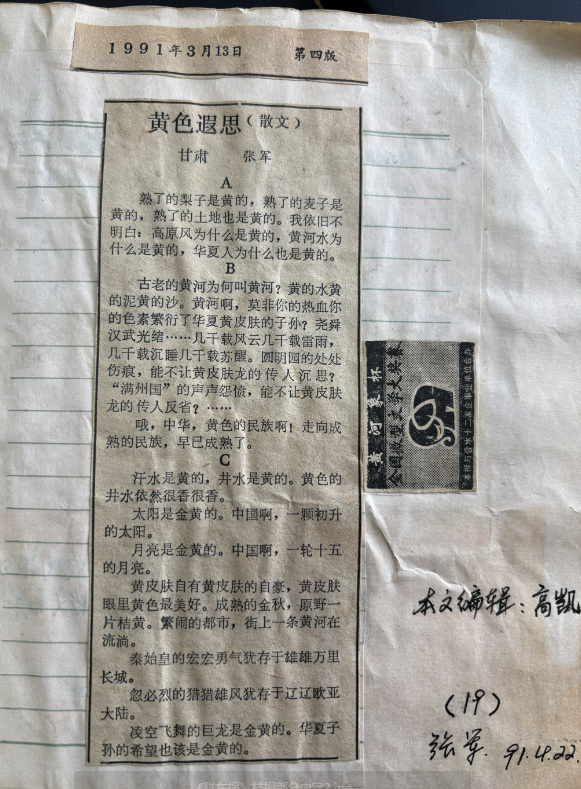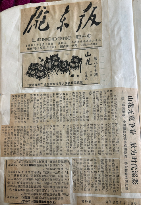 幾天后,一篇題為《黃色遐思》的散文終于誕生了,這篇短文通過一系列的聯(lián)想與描述,表達了自己對黃土地、華夏民族以及偉大祖國的無限感激與熱愛。1991年1月13日晚上,我將最終定稿的散文《黃色遐思》工工整整地寫在自己特意買來的稿紙上,小心翼翼地裝進信封,第二天,騎自行車冒著刺骨的寒風到五公里之外的縣城郵局去郵寄。稿件寄出之時,我仿佛完成了一份光榮的任務。盡管之前自己已經(jīng)在其他報紙上發(fā)表過幾篇習作,但這次畢竟是第一次給心目中神圣的家鄉(xiāng)報紙《隴東報》投稿,心里既興奮又緊張。驚喜有時會在不經(jīng)意間突然降臨。近兩個月之后,我驚喜地發(fā)現(xiàn)自己的散文《黃色遐思》刊發(fā)在1991年3月13日的《隴東報》第四版“黃河象杯”全國微型文學大獎賽專版上。不久,我便收到了編輯部寄來的墨香濃郁的樣報。