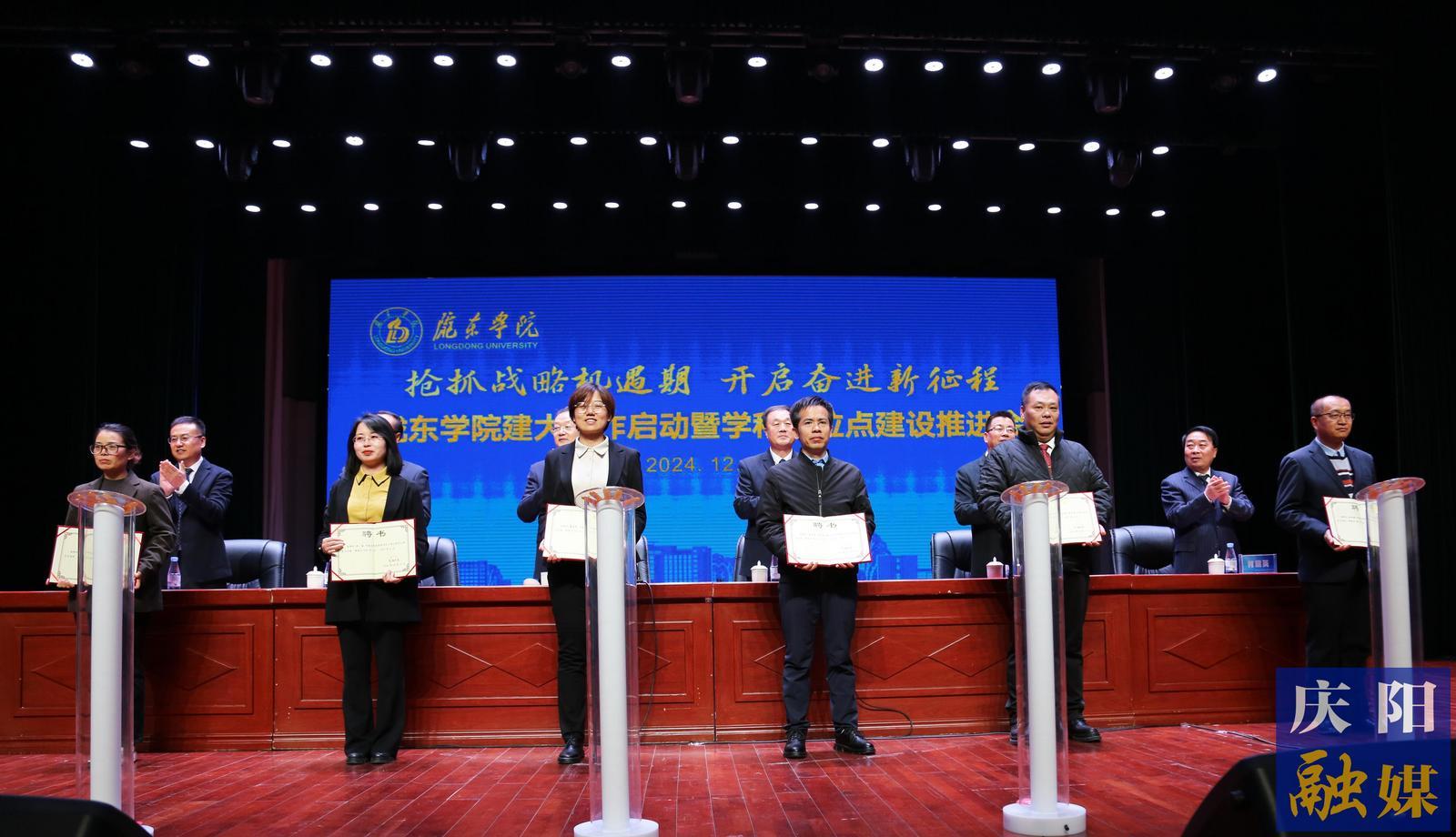 會上,宣讀了《國務(wù)院學(xué)位委員會關(guān)于下達(dá)2023年度審核增列的博士、碩士學(xué)位授予單位及其學(xué)位授權(quán)點(diǎn)名單的通知》和《隴東學(xué)院關(guān)于聘任胡浩斌等同志為碩士研究生導(dǎo)師的通知》,并為材料與化工、土木水利、生物與醫(yī)藥三個(gè)碩士學(xué)位點(diǎn)授牌,為碩士研究生導(dǎo)師代表頒發(fā)聘書,舉辦隴東學(xué)院建設(shè)西部高水平應(yīng)用型大學(xué)啟動(dòng)儀式,解讀建大指標(biāo)并通報(bào)當(dāng)前建設(shè)情況。