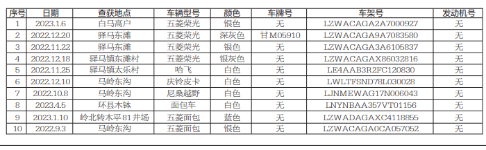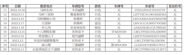 為了認(rèn)真貫徹落實(shí)全市油區(qū)治安管理工作會(huì)議精神,嚴(yán)厲打擊涉油“三無(wú)”車(chē)輛,依據(jù)國(guó)家相關(guān)法律法規(guī)規(guī)定,現(xiàn)將2021年1月至2023年1月期間,在環(huán)縣、慶城、華池油區(qū)查獲的48臺(tái)無(wú)牌、無(wú)證、無(wú)法確認(rèn)車(chē)主,且發(fā)動(dòng)機(jī)號(hào)/車(chē)架號(hào)損毀(挫改)嚴(yán)重的“三無(wú)”車(chē)輛進(jìn)行公告,請(qǐng)車(chē)輛所有人自本公告發(fā)布之日起3個(gè)月內(nèi),前來(lái)慶陽(yáng)市公安局長(zhǎng)慶分局治安警察大隊(duì)接受處理,逾期不接受處理者,將按無(wú)主車(chē)輛予以拆解報(bào)廢。