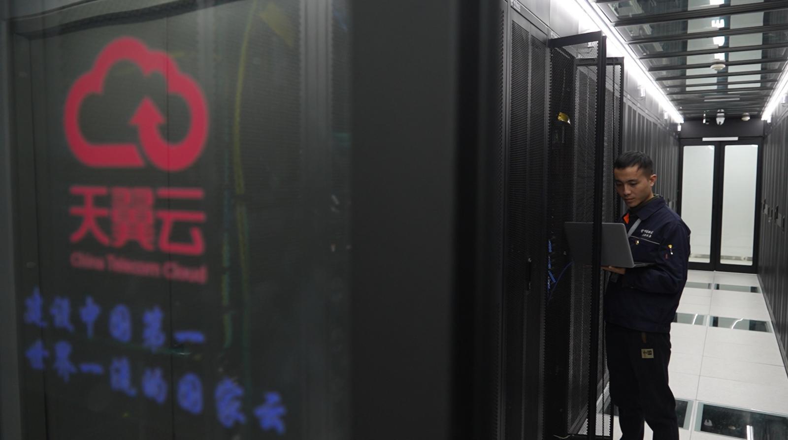 慶陽(yáng)電信天翼云數(shù)據(jù)機(jī)房,工程師正在進(jìn)行日常維護(hù)