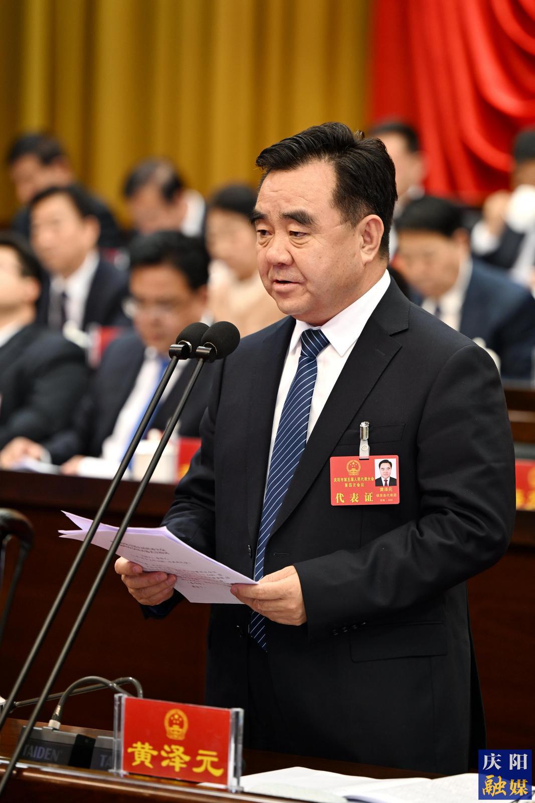 主席團(tuán)常務(wù)主席黃澤元主持大會。上午9時,黃澤元宣布:慶陽市第五屆人民代表大會第四次會議開幕!全體起立,奏唱中華人民共和國國歌。