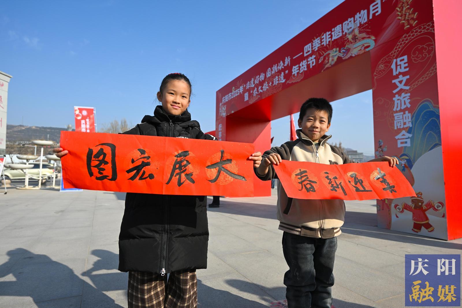 小朋友展示獲贈(zèng)的春聯(lián)。