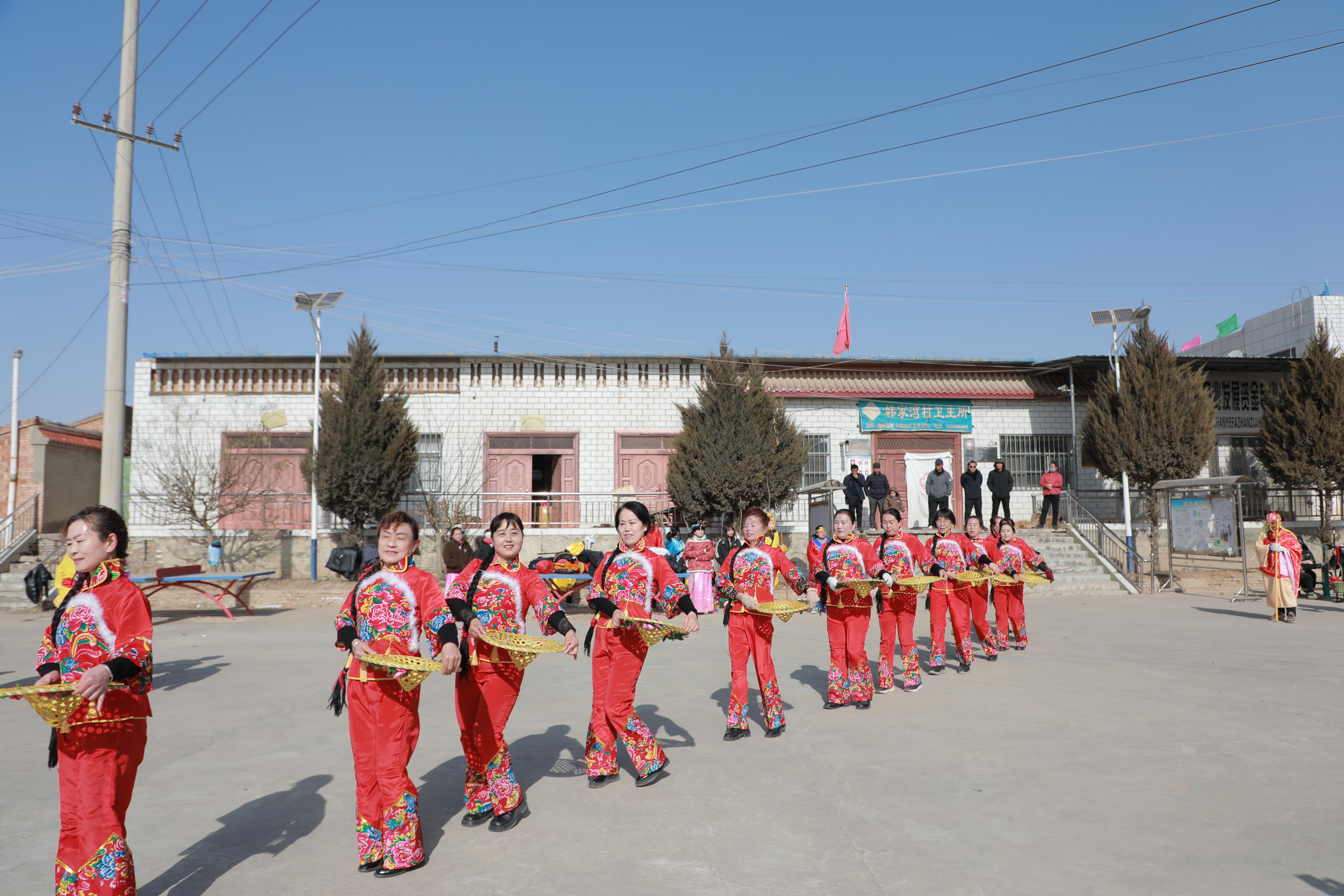2月8日上午,室外溫度達(dá)到了零下十二攝氏度,但和寒冷天氣形成鮮明對比的是火熱的慶城縣社火排練現(xiàn)場。當(dāng)記者來到三十鋪鎮(zhèn)韓灣村時(shí),社火《慶豐收》的演員們個(gè)個(gè)熱情高漲、精神抖擻,不畏嚴(yán)寒緊張地排練著。