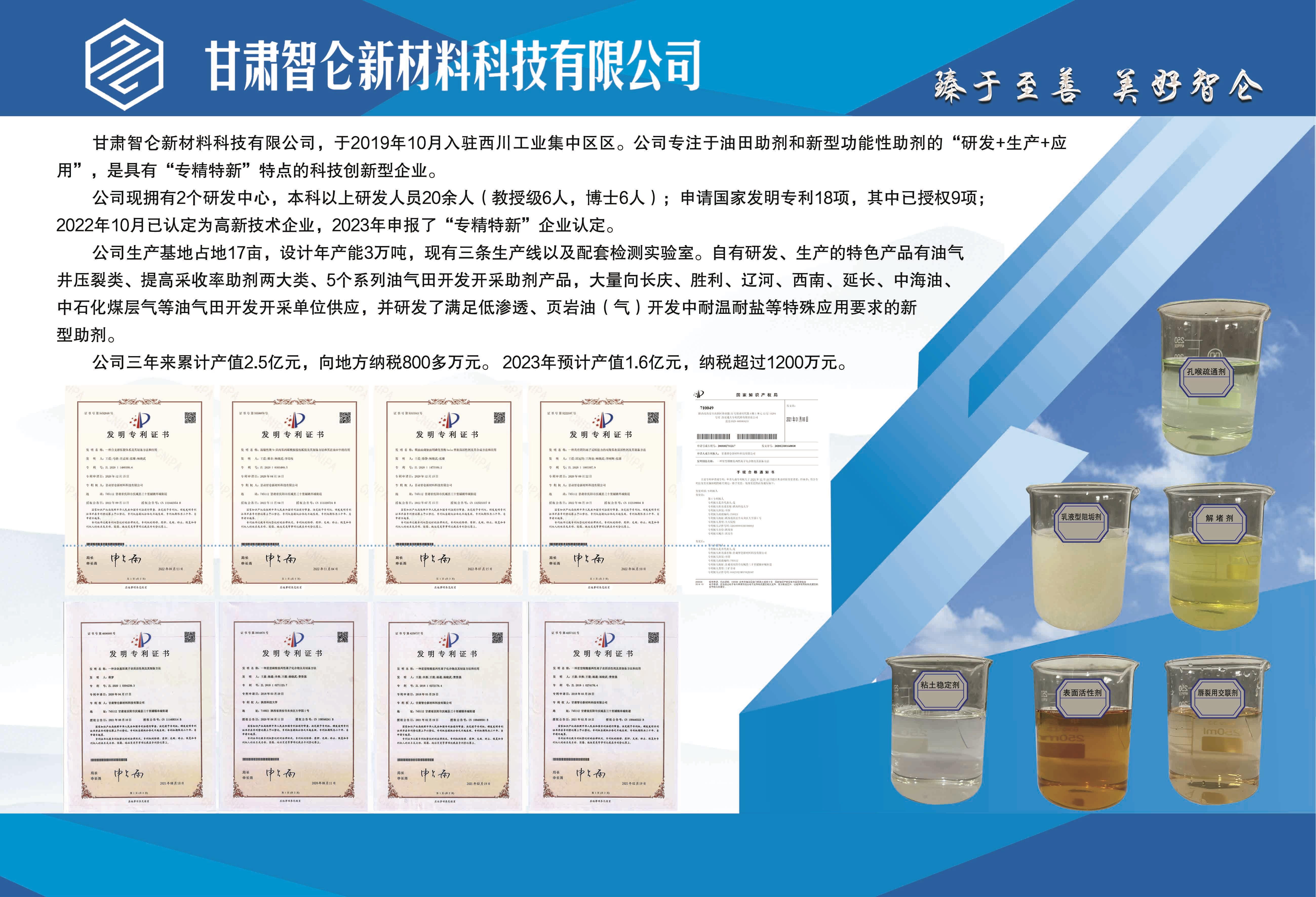 甘肅智侖新材料科技有限公司成立于2019年10月,注冊(cè)資金2000萬(wàn)元,是一家專(zhuān)注于油田助劑和新型功能型助劑“研發(fā)+生產(chǎn)+應(yīng)用”的科技創(chuàng)新型企業(yè)。建成了年產(chǎn)8000噸油田助劑生產(chǎn)線3條及檢測(cè)實(shí)驗(yàn)室1個(gè),企業(yè)擁有2個(gè)研發(fā)中心,研發(fā)人員20余人。累計(jì)產(chǎn)值3.8億元,累計(jì)納稅2200萬(wàn)元。