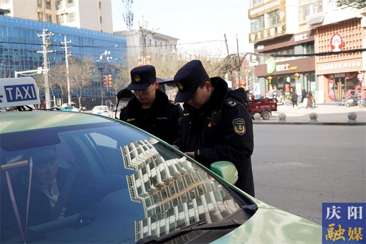▲環(huán)縣道路運(yùn)輸管理局工作人員在縣城盤旋路檢查巡游出租汽車運(yùn)載情況。