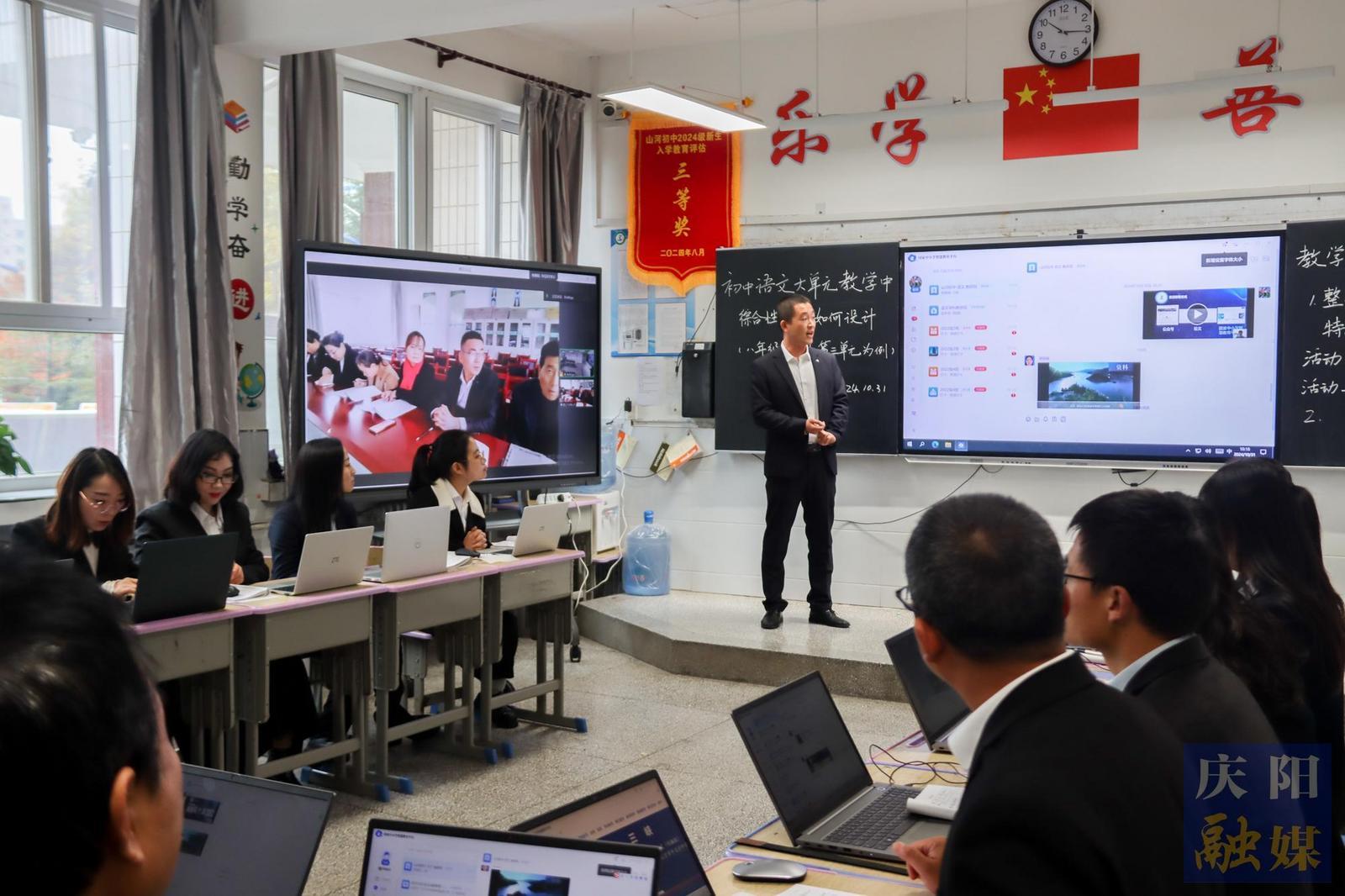 2024年10月31日,在正寧縣山河初中,語(yǔ)文學(xué)科教研組開(kāi)展云端教研,研究相關(guān)課題。