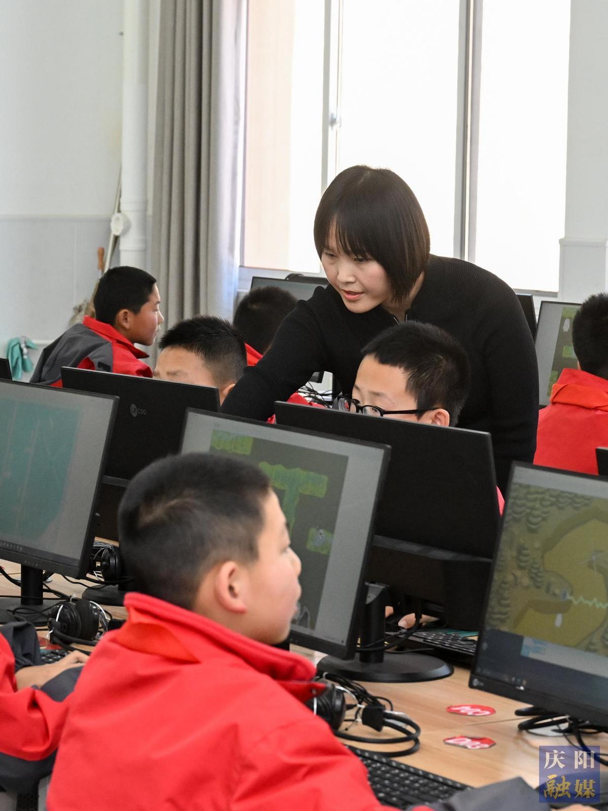 2月25日,在鎮(zhèn)原縣蓮池小學(xué),學(xué)生們?cè)诶蠋煹闹笇?dǎo)下利用編程知識(shí)創(chuàng)作簡(jiǎn)單的游戲程序。