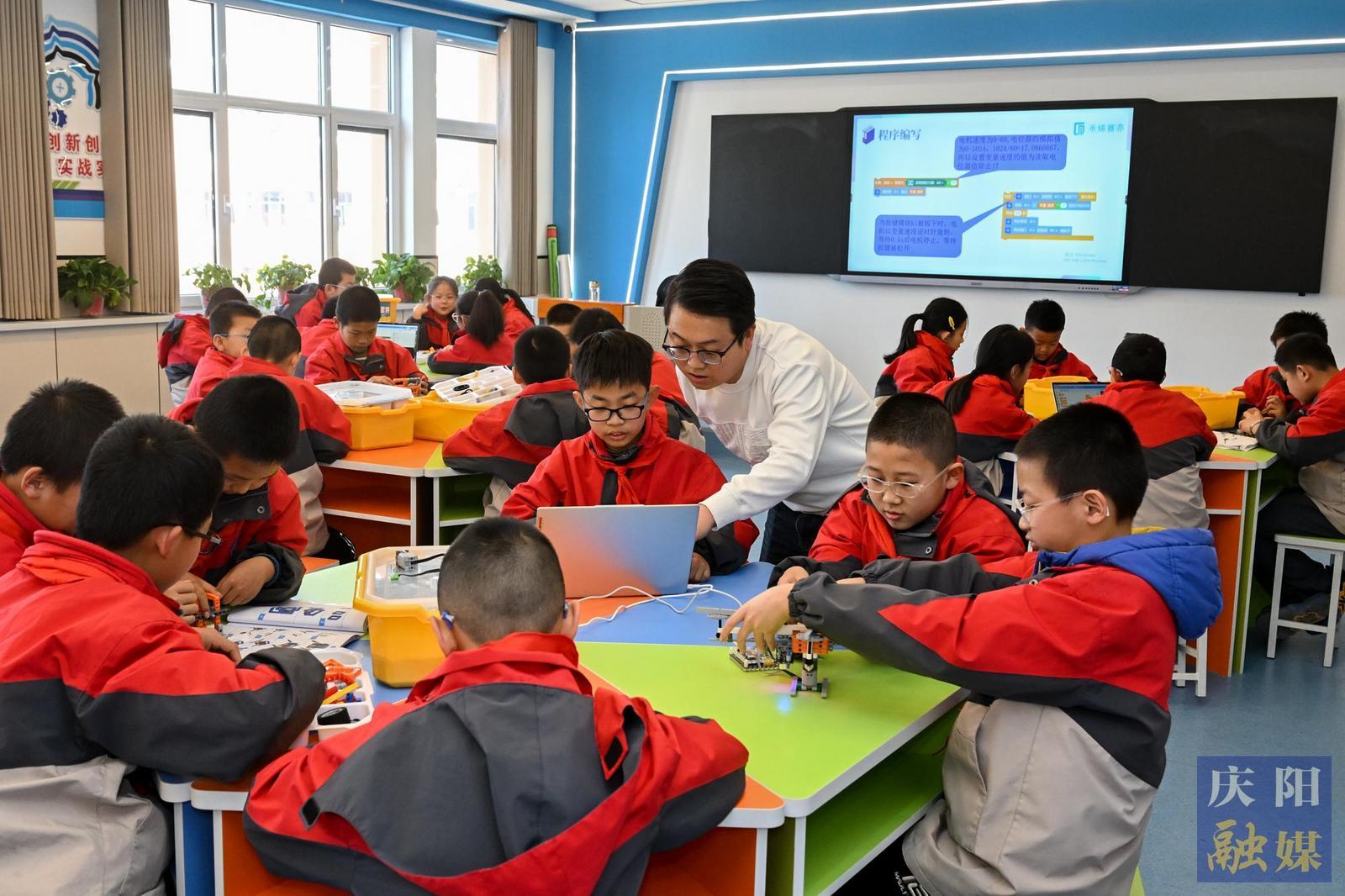2月25日,在鎮(zhèn)原縣蓮池小學(xué),學(xué)生在創(chuàng)客教育課上學(xué)習(xí)程序編寫(xiě)知識(shí),組裝創(chuàng)意編程套件。