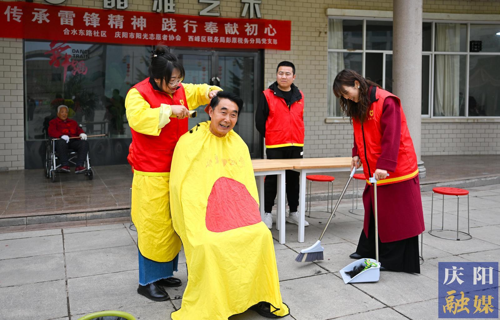慶陽市陽光志愿者協(xié)會的志愿者為西峰區(qū)麗景家園小區(qū)居民理發(fā)。
