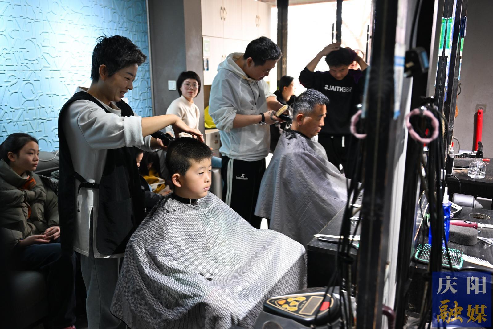 西峰區(qū)大街小巷的理發(fā)館內人大孩子排隊“剃龍頭”。