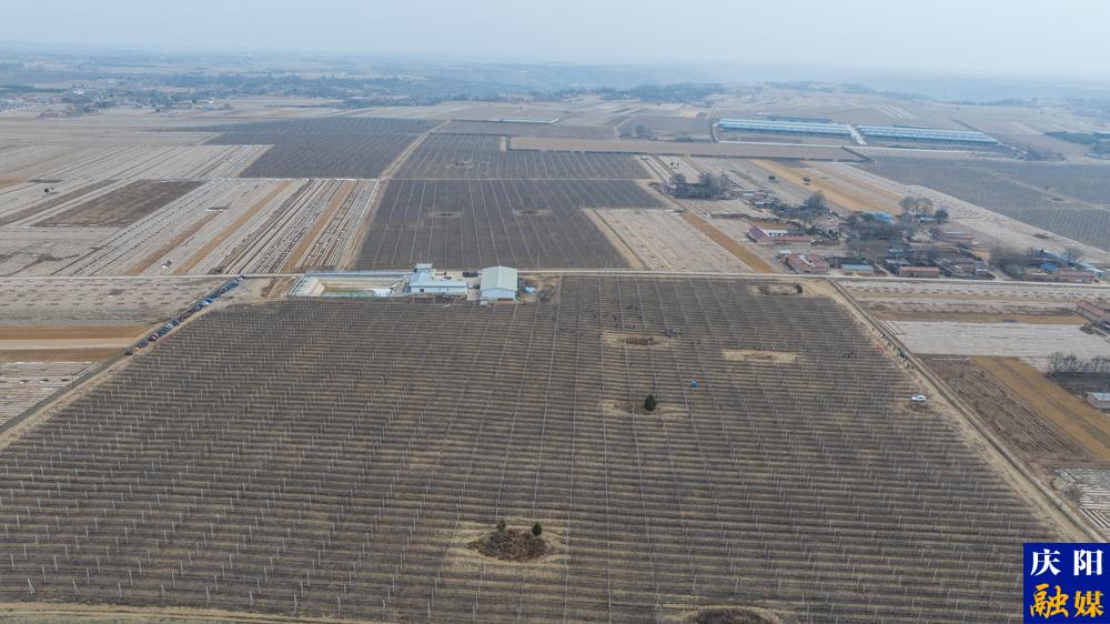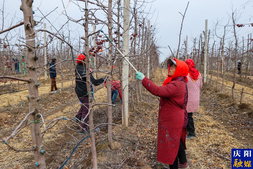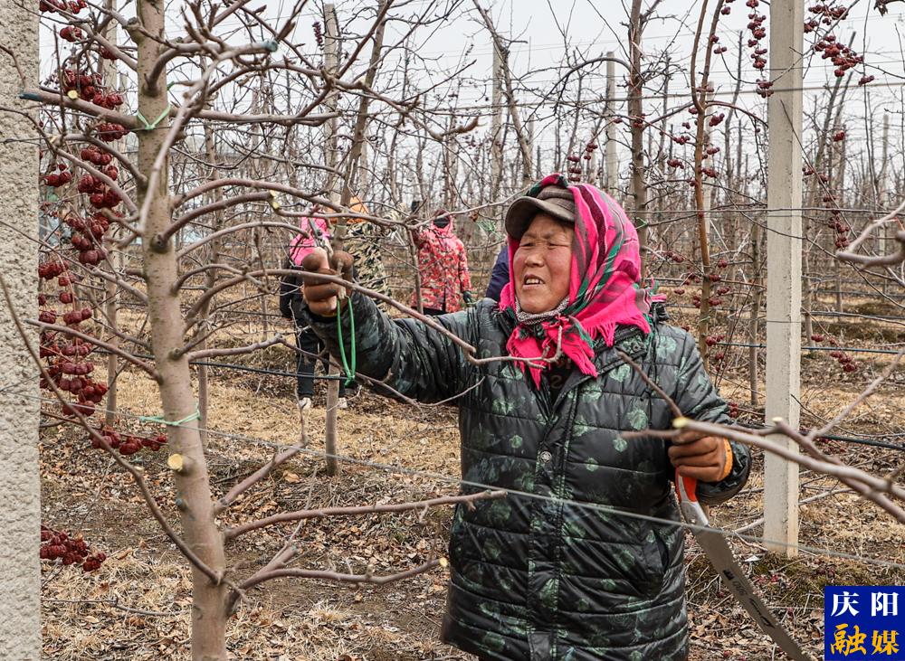 鎮(zhèn)原縣五指平園果業(yè)有限公司蘋果基地工人開展剪枝、涂藥、清理樹枝等工作。