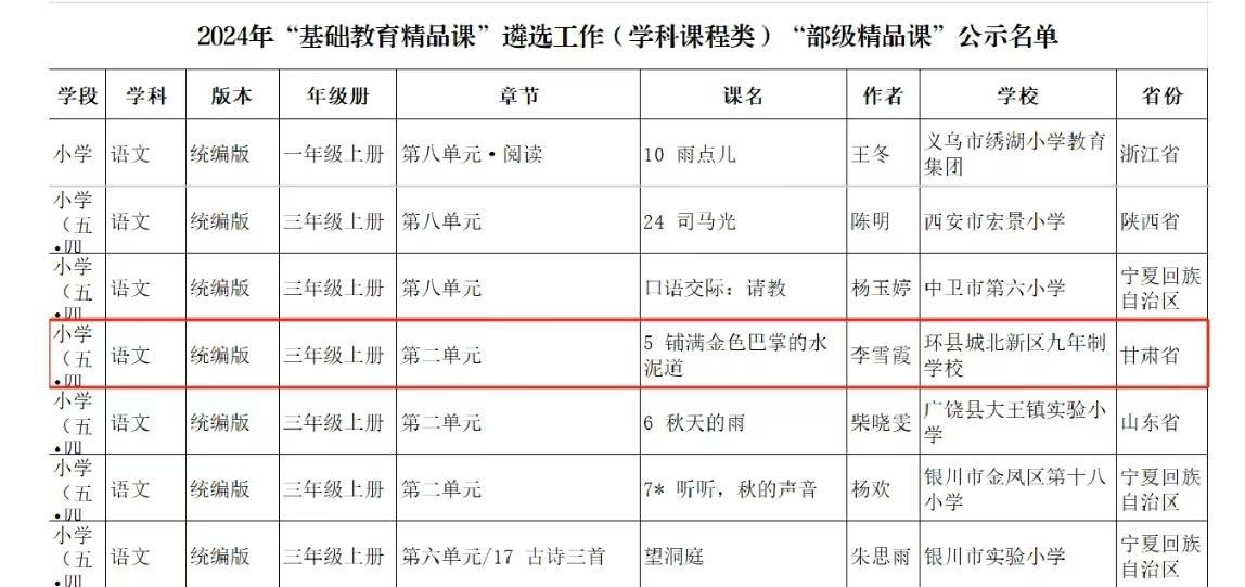 慶陽網(wǎng)訊(慶陽融媒記者 劉英娟) 日前,教育部遴選的2024年“基礎(chǔ)教育精品課”名單揭曉,環(huán)縣城北新區(qū)九年制學校語文教師李雪霞執(zhí)教的《鋪滿金色巴掌的水泥道》成功入選。這份榮譽,源自她二十二載扎根黃土地的堅守。