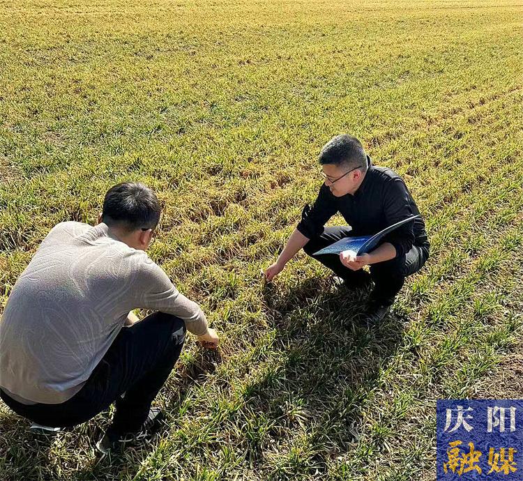 ▲慶陽市氣象部門工作人員進(jìn)行麥田墑情調(diào)查。