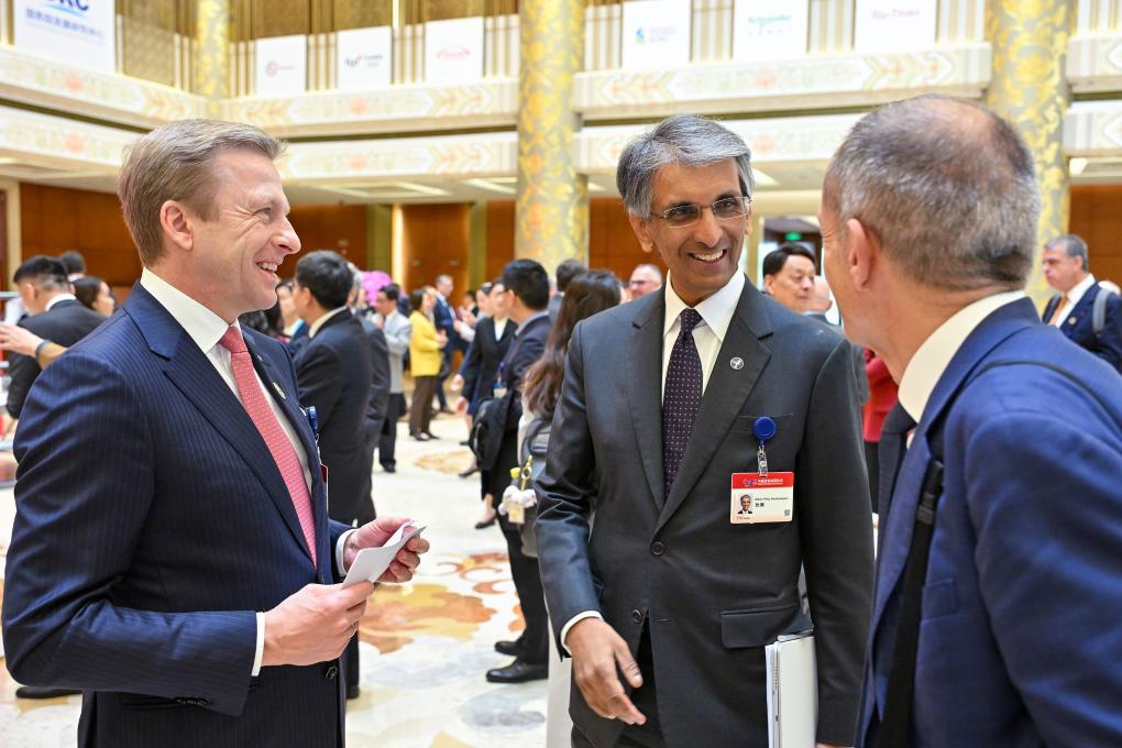 參加中國發(fā)展高層論壇2025年年會的嘉賓在論壇茶歇時交流。新華社記者 李鑫 攝