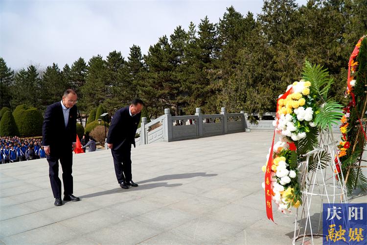 隴東學(xué)院附屬中學(xué)師生向南梁革命烈士紀(jì)念碑敬獻(xiàn)花籃。