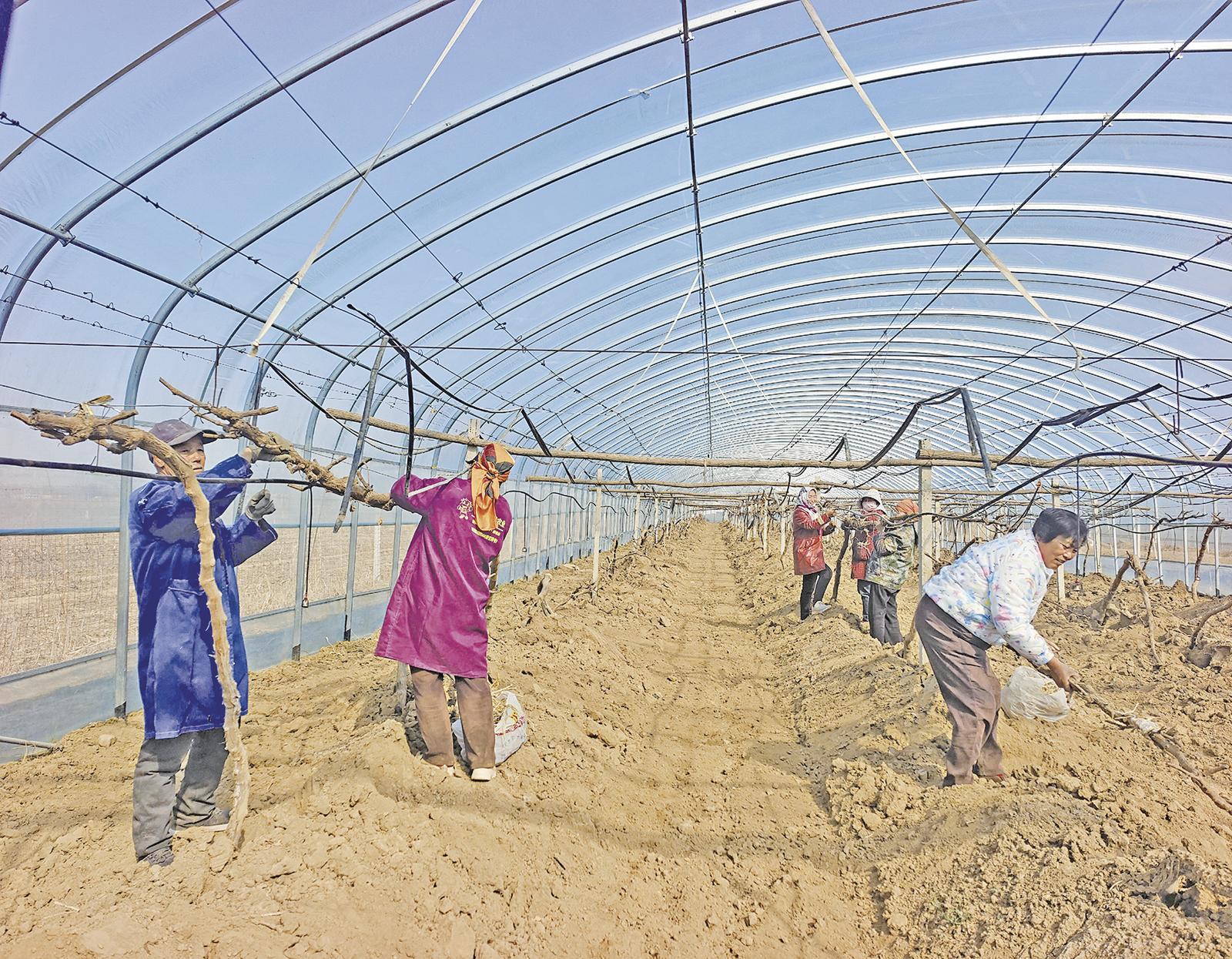 葡萄藤起土上架是葡萄種植過程中一項(xiàng)至關(guān)重要的農(nóng)耕措施。冬季,為了防止葡萄藤遭受低溫凍害,合作社對葡萄藤進(jìn)行修剪,并用土壓埋。次年春季再起藤上架,這樣做既能保障葡萄藤安全越冬,又能促進(jìn)果苗花芽分化,開始新一輪的生長周期。
