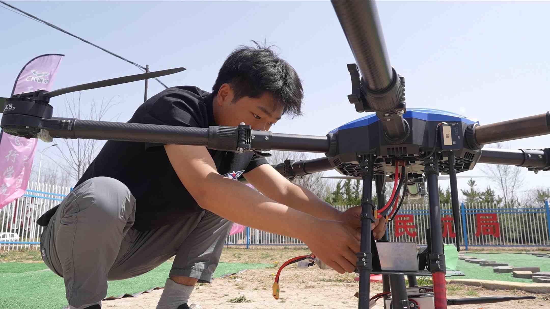 飛手正在為無(wú)人機(jī)更換電池。馮喜斌攝