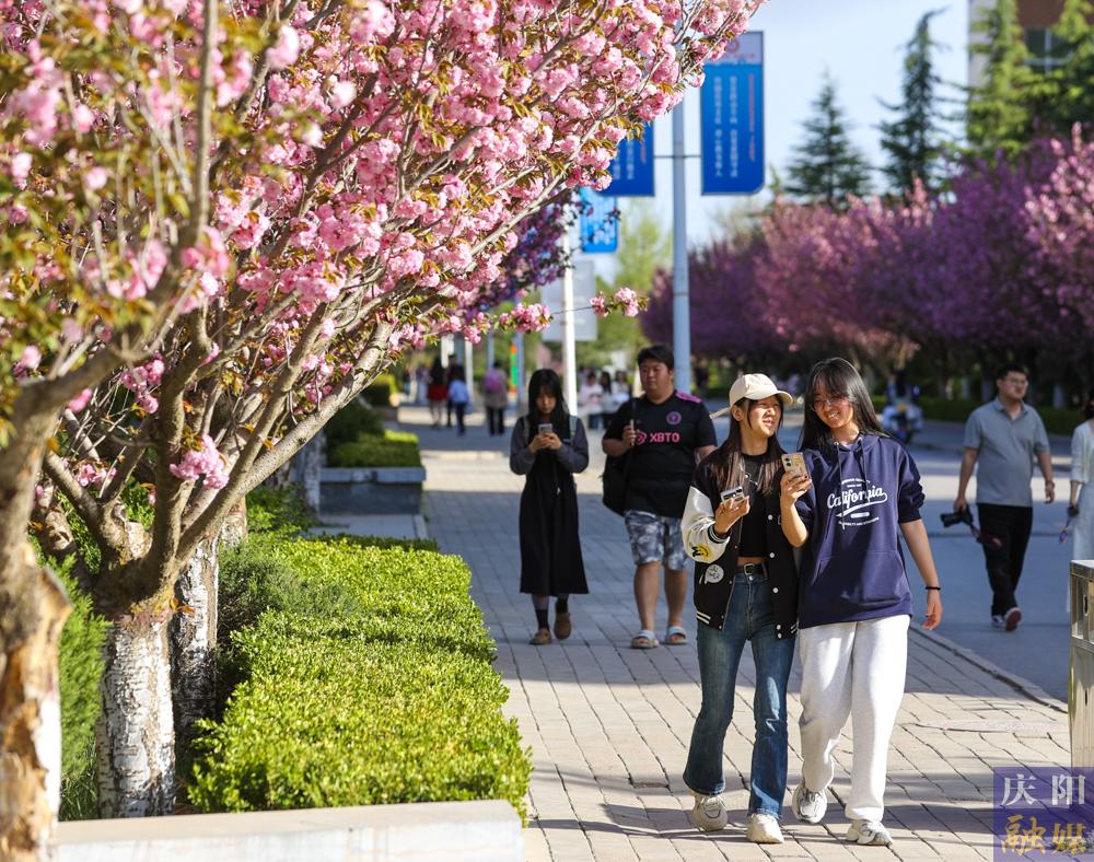 隴東學(xué)院櫻花盛開,學(xué)生在校園內(nèi)拍照打卡。