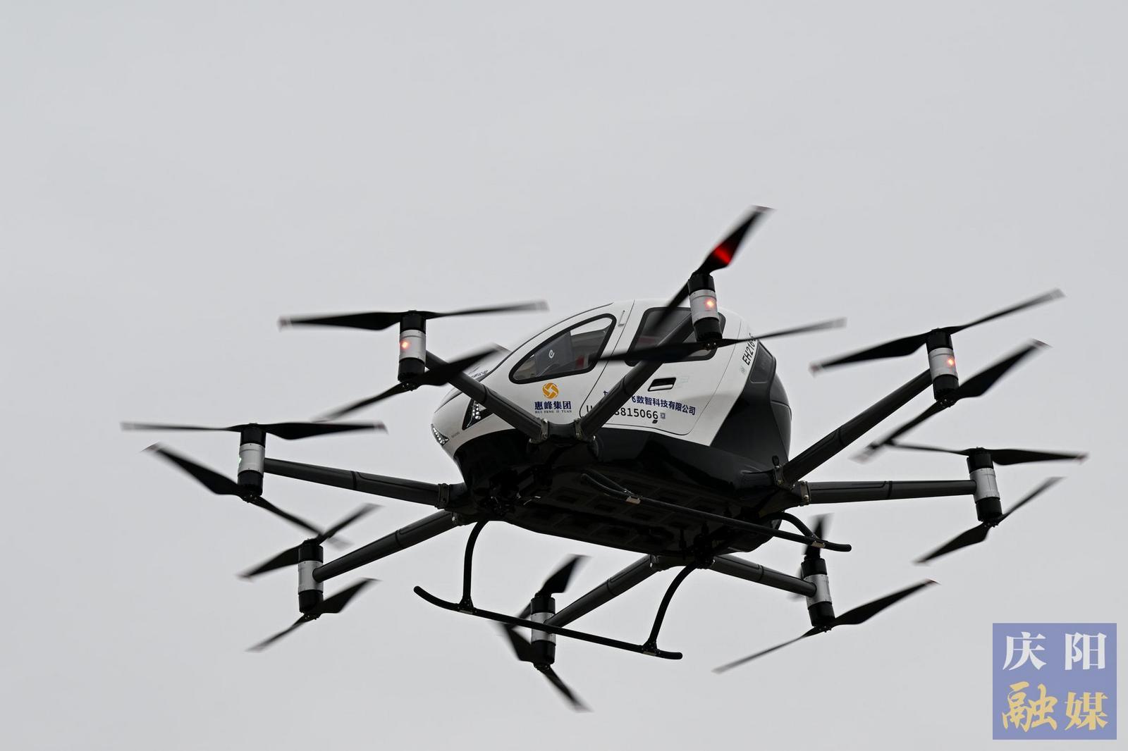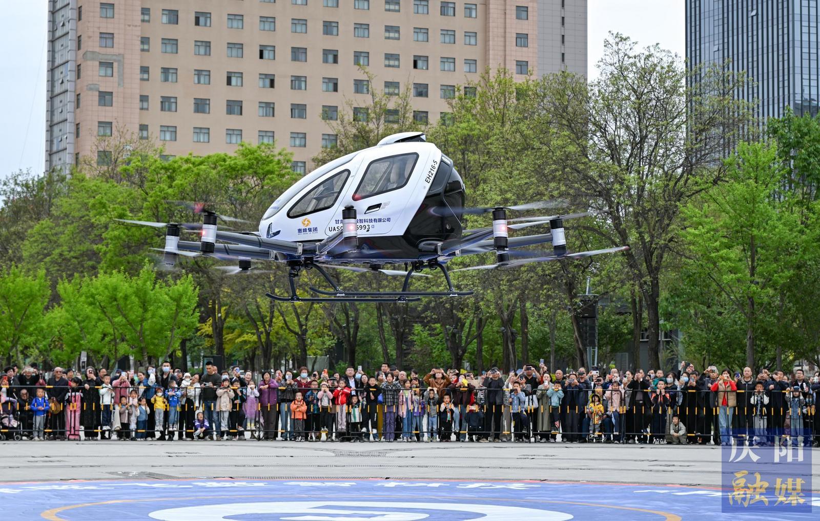 2025數(shù)字中國創(chuàng)新大賽·低空經(jīng)濟(jì)賽道技術(shù)成果驗(yàn)證環(huán)節(jié),基于北斗伏羲空中紅綠燈支持下的億航智能公司eVTOL慶陽和諧廣場首飛。