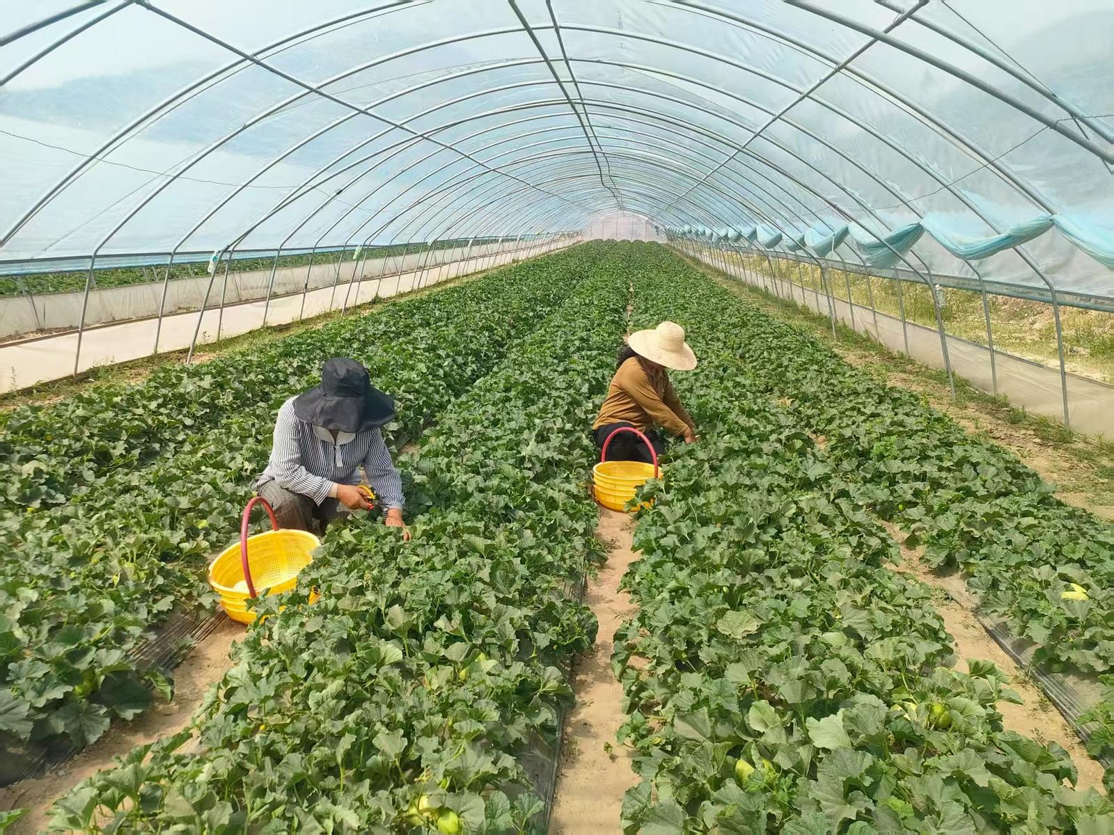 游客在蔡家廟鄉(xiāng)大堡子村的大棚里采摘香瓜