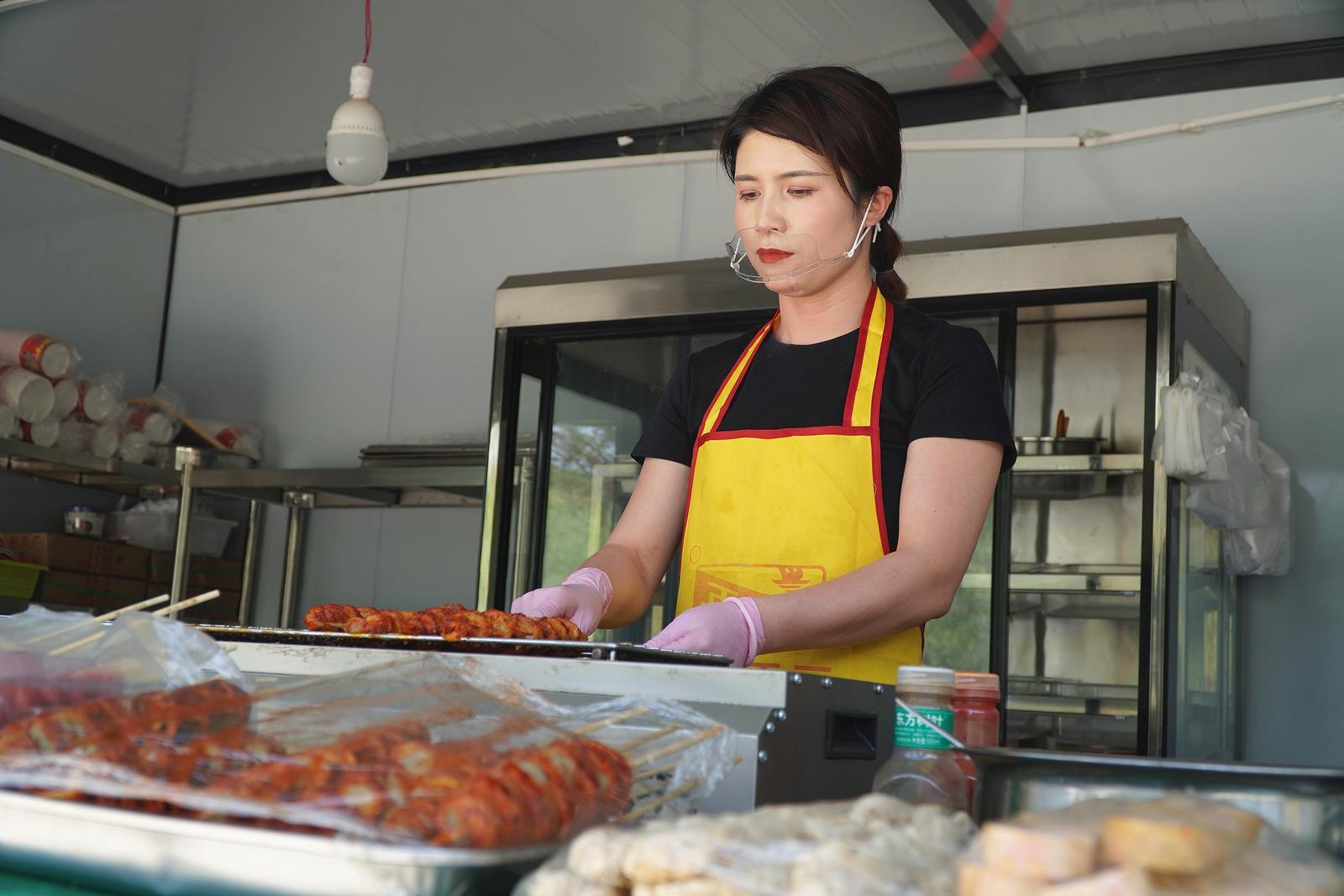 王肖虎主要經(jīng)營火爆魷魚、涼面等小吃。“門店都統(tǒng)一風格、免費使用,這樣就節(jié)省了房租費用?!蓖跣せ⒄f,開業(yè)1個多月,店里每天的銷售額都在幾百元至千元不等,假期游客多的時候,一天能賣4000多元。
