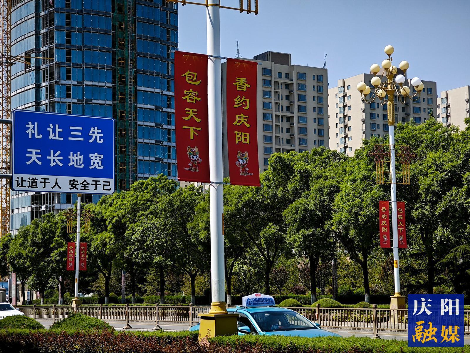 西峰區(qū)岐黃大道兩側節(jié)會主題道旗整齊排列。