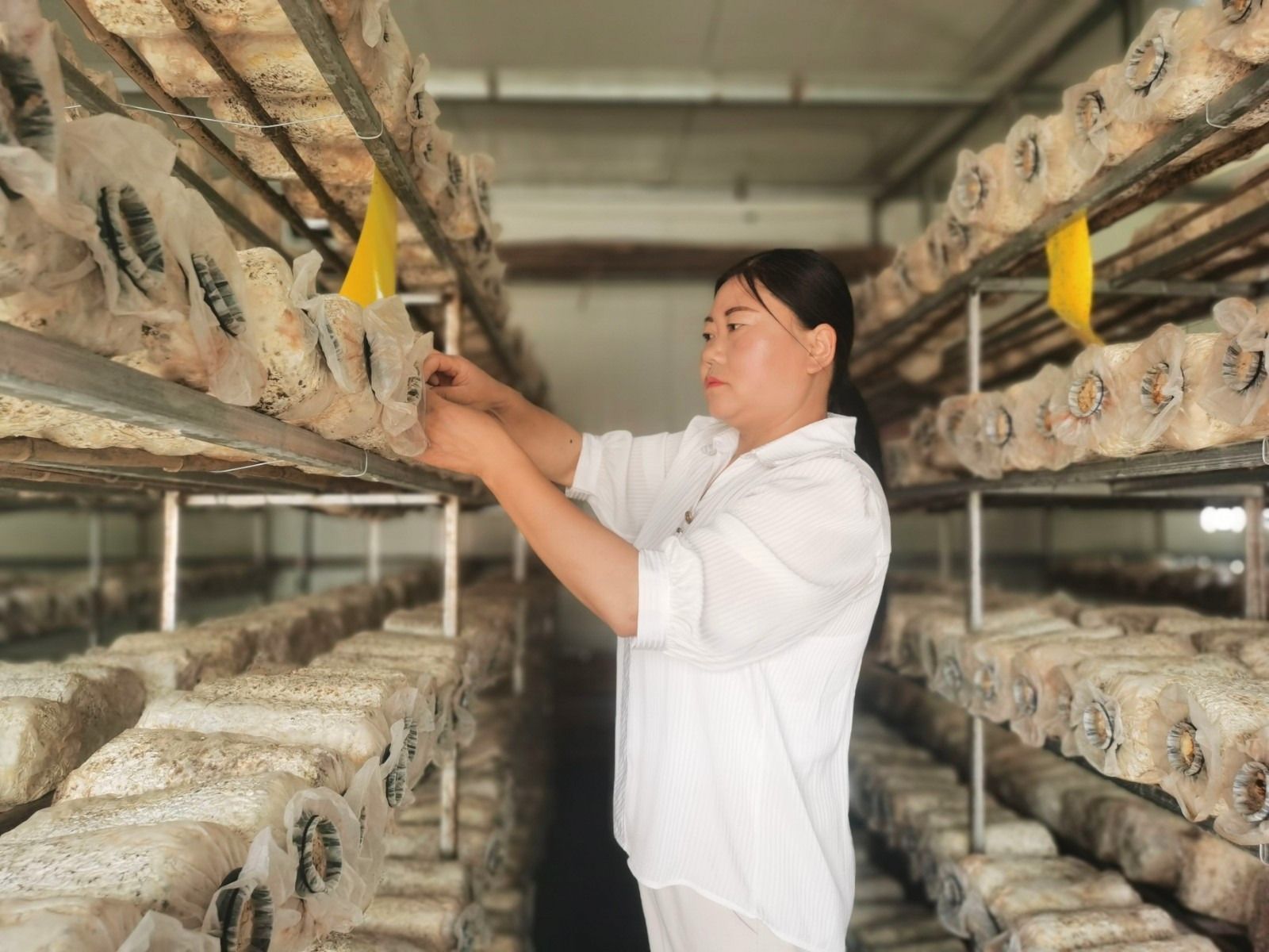 賈亞亞正在自己菇房內(nèi)整理菌棒