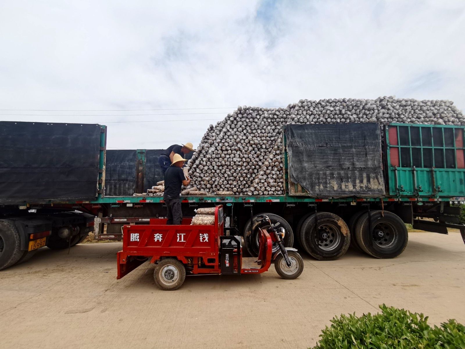 慶陽百禾農(nóng)業(yè)科技有限公司基地內(nèi)工人正在運(yùn)輸菌棒