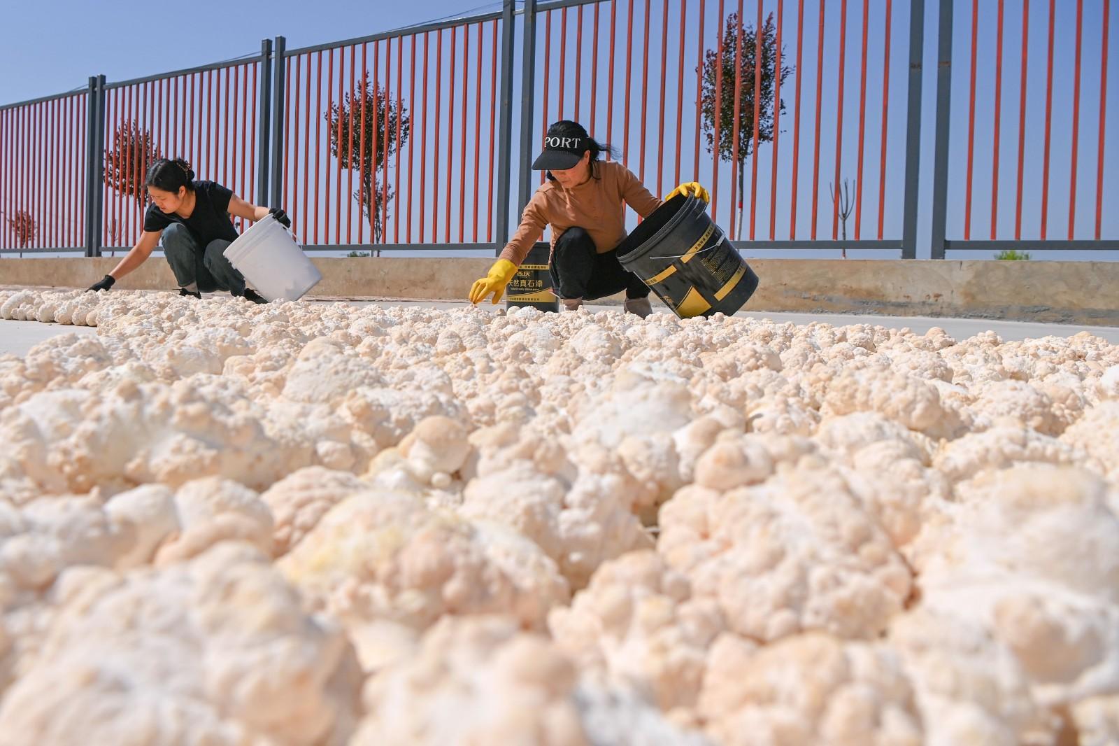 工人正在晾曬剛采摘的猴頭菇
