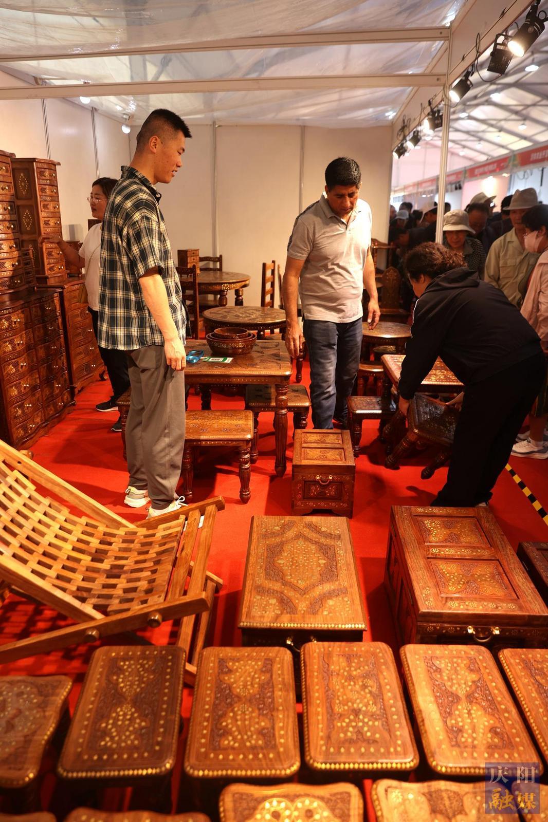 非遺沉浸式體驗(yàn)區(qū)展棚內(nèi),巴基斯坦木質(zhì)家具器物展銷。
