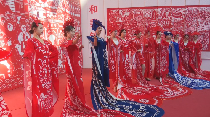 活動現(xiàn)場,多位國內(nèi)外超模身著“剪云裳”剪紙服飾依次走上T臺,走進展館。這些服飾以我縣剪紙大師祁秀梅的經(jīng)典紋樣為藍本,將中國傳統(tǒng)剪紙藝術(shù)與現(xiàn)代時尚設(shè)計巧妙融合。大V領(lǐng)、魚尾裙、聳肩收腰等設(shè)計新穎別致,生命樹、鳳戲牡丹、魚鉆蓮、抓髻娃娃等剪紙圖案栩栩如生,紅與青瓷藍為主色調(diào)碰撞出強烈的視覺沖擊力,每一步都搖曳生姿,舉手投足間盡顯東方韻味與國際時尚的完美融合,讓現(xiàn)場觀眾大飽眼福,紛紛拿出手機拍照留念。