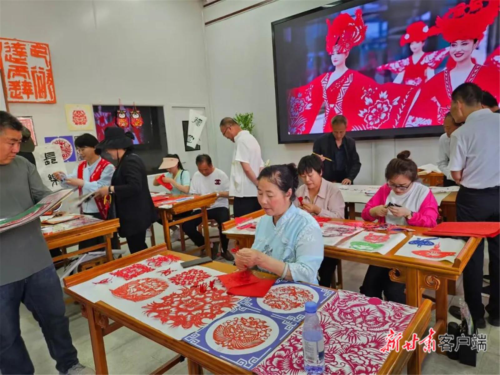 鎮(zhèn)原縣非遺傳承人向群眾展演剪紙技藝。