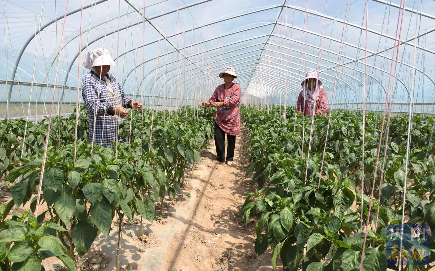 西峰區(qū)溫泉鎮(zhèn)齊樓村設(shè)施蔬菜基地工人給辣椒苗吊蔓。