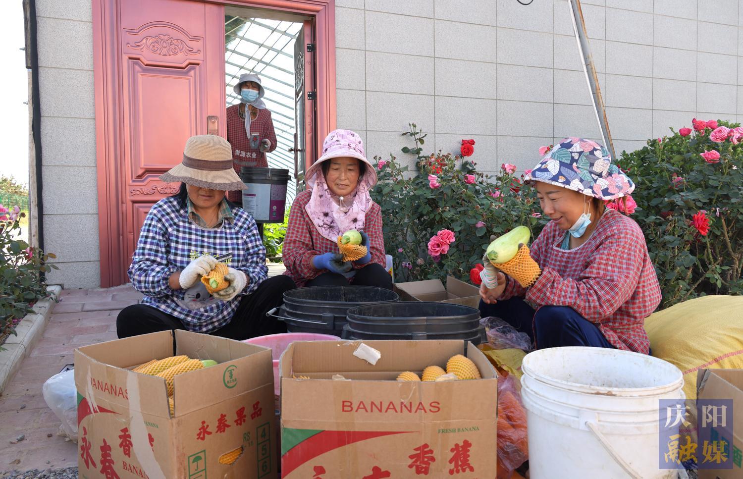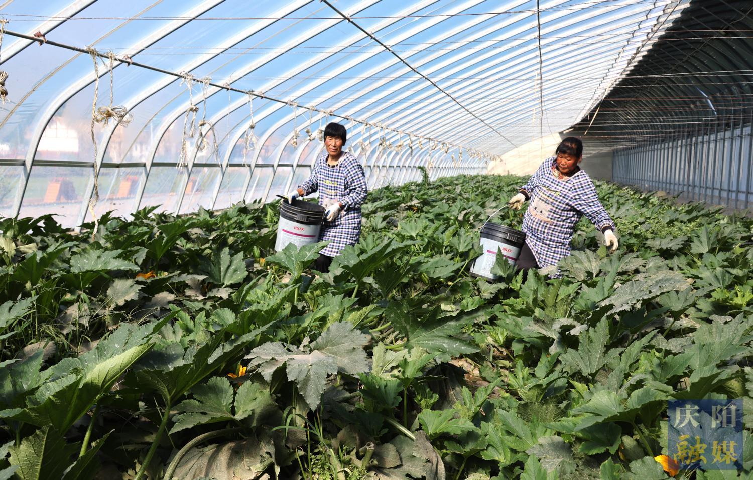 西峰區(qū)什社鄉(xiāng)李嶺村設(shè)施瓜菜基地工人采摘西葫蘆。