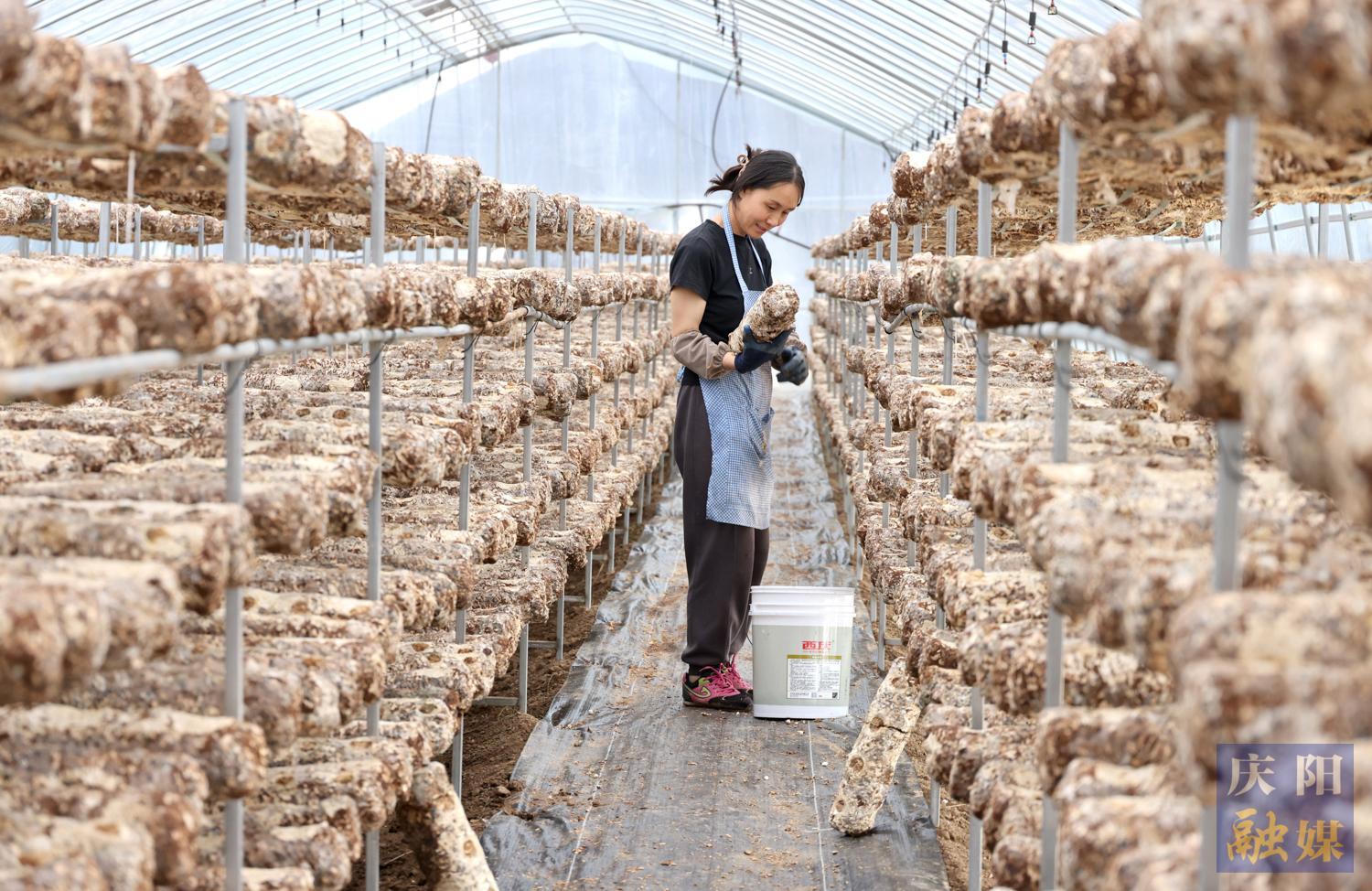 6月5日,西峰區(qū)后官寨鎮(zhèn)司官寨村村民管護(hù)香菇菌棒。