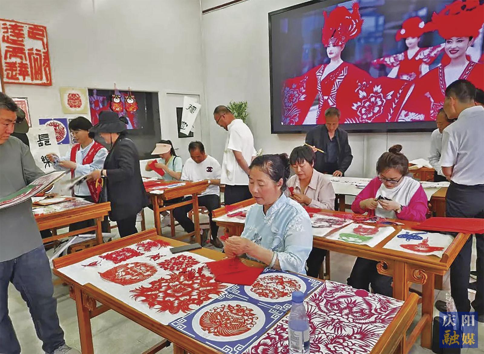 鎮(zhèn)原縣非遺傳承人向群眾展示剪紙技藝。