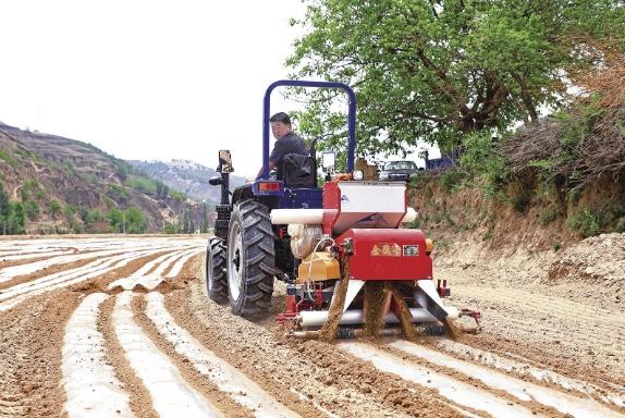 在郝集村的農(nóng)田里,伴隨著覆膜機(jī)的轟鳴聲,銀白色的地膜整齊鋪展,村民緊隨其后覆土壓實(shí),成片的地膜在黃土塬上形成一道獨(dú)特的風(fēng)景?!拔覀冋{(diào)動(dòng)了全村所有農(nóng)業(yè)機(jī)械,旋耕機(jī)、覆膜機(jī)、播種機(jī)一應(yīng)俱全,確保群眾搶種過(guò)程中機(jī)械調(diào)配及時(shí)?,F(xiàn)在我們大面積種植‘小日月’玉米和大豆、馬鈴薯,目前已經(jīng)種植玉米1500畝左右、大豆400畝左右?!焙录妩h支部書(shū)記郝祥敏說(shuō)。