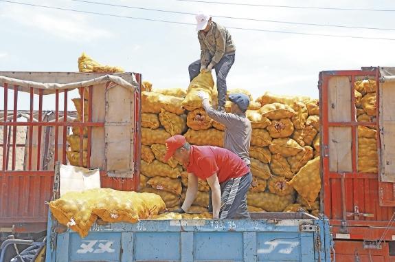 日前,在蘆家灣鄉(xiāng)宋家掌村的馬鈴薯籽種卸貨現(xiàn)場(chǎng),三四輛滿載著馬鈴薯籽種的掛車整齊停放,村民們排隊(duì)等待拉運(yùn)。