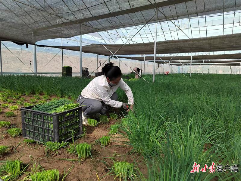 甘肅聚廣利現(xiàn)代設施蔬菜種植基地工人收割成熟的香蔥。
